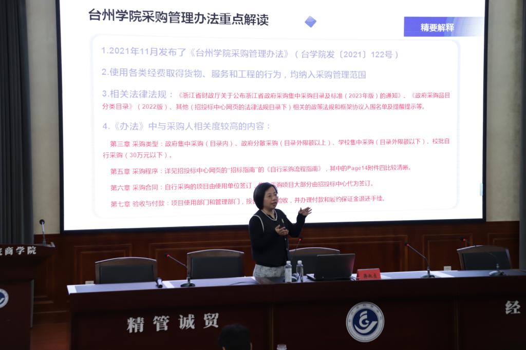 本次培训由招投标中心蒋淑贞老师主讲。她以《台州学院采购管理办法》为核心依据,系统介绍了“采申-比价-备案”的全流程管理,对采购过程中容易出现的误区、疑点和风险领域进行了重点强调,特别对2025年11月1日起实施的非合规采购管理新规进行了重点说明,还结合政采云平台实操演示,对框架协议采购、网上超市采购等不同采购方式的操作流程进行了现场指导。