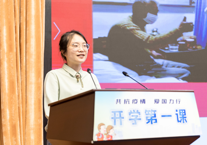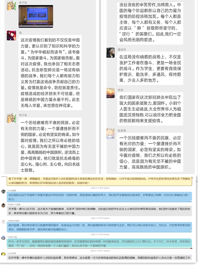 课堂上,他们分享了援鄂抗疫故事中的点点滴滴,特殊的年夜饭、想儿子、穿脱防护服、病人竖大拇指、机场过水门……一个个生动的场景,一张张感人的画面,全都定格在了每一位观看者的脑海里。当听到讲述者哽咽说出“春天一定会来”、自豪唱出“五星红旗迎风飘扬,胜利歌声多么响亮”、大声喊出“我们现在的样子,就是国家未来的样子”的时候,课堂内外涌动着一股强烈的爱国主义激情,大家感动于为生为一名中国人的自豪,感动于伟大祖国是我们永远坚强的后盾的深情,感动于疫情以来的全体中国人携手谱写而成的中国力量、中国精神、中国效率。