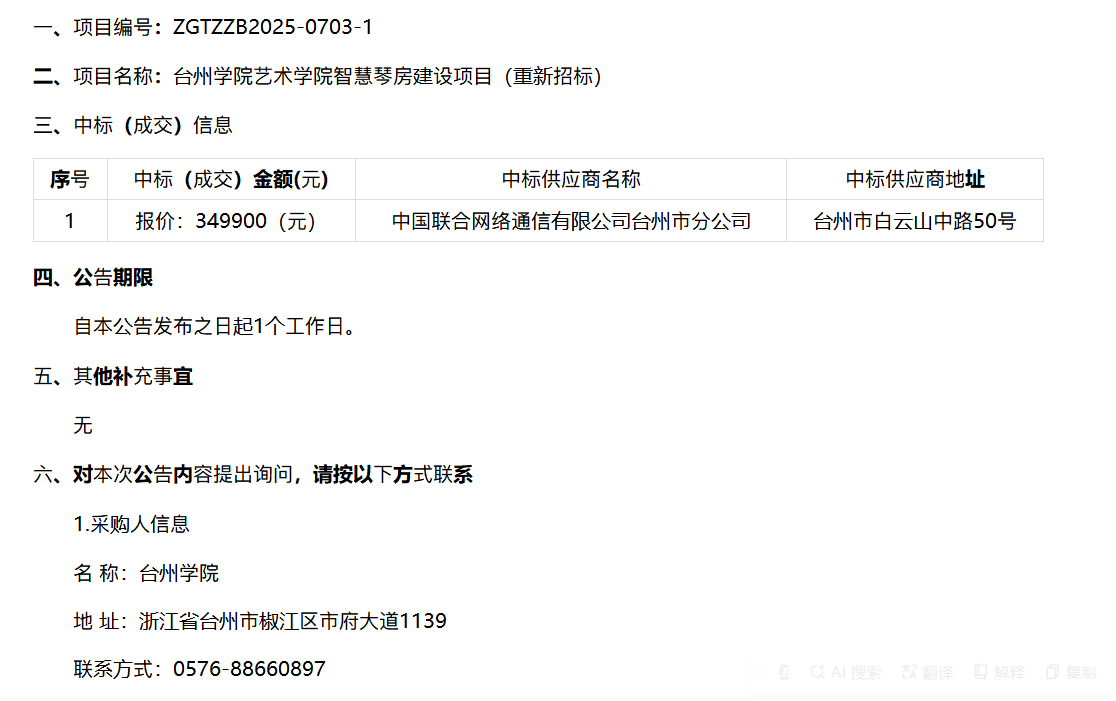 台州学院艺术学院智慧琴房建设项目(重新招标)中标(成交)结果公告